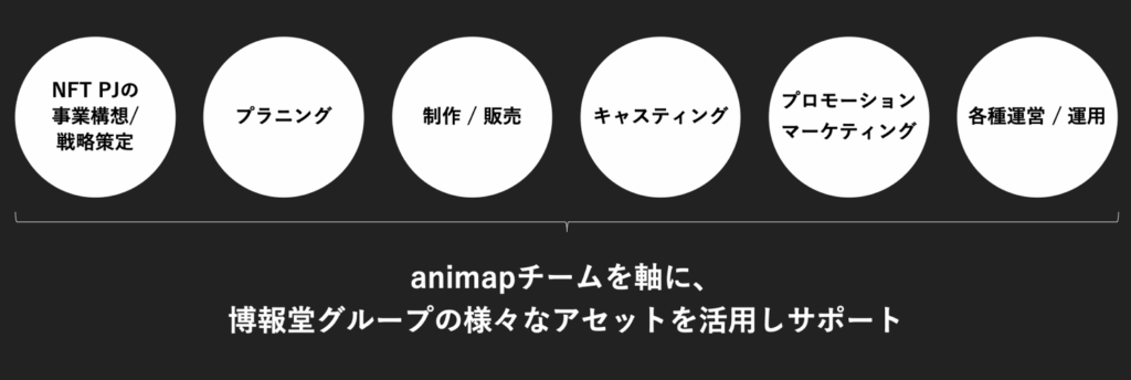 With “animap” at the core, we have built a system that can provide one-stop support from digital content development to sales, enabling us to support NFT business promotion as a partner for companies/creators who want to engage in NFT business.